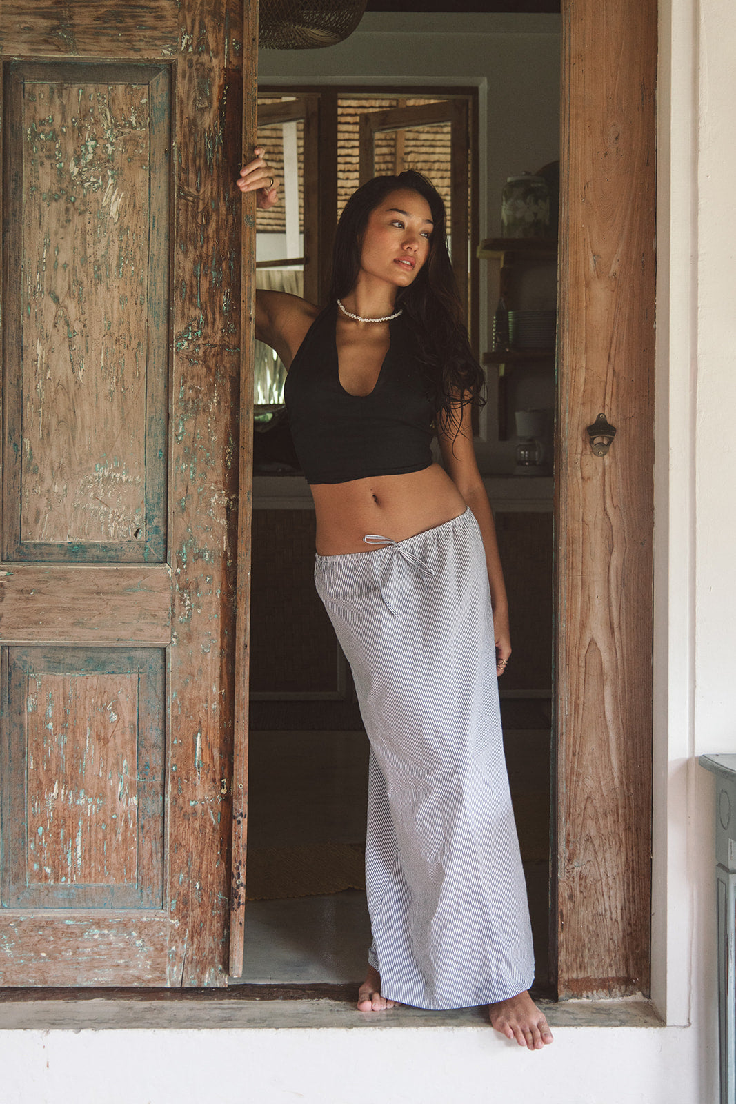 Step into the easy elegance of the Zoe Drawstring Skirt, the perfect pendant to our tribe favorite Alo. Crafted from premium organic cotton, this flowing skirt features a refined black and white fine pinstripe, evoking timeless sophistication with a carefree spirit.